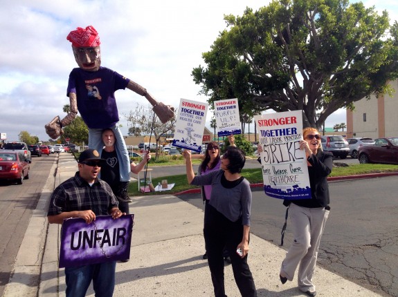 Fifteen picketers started at dawn outside Purple’s San Diego worksite. The crowd nearly doubled by mid-day, as members of SEIU and other unions, students and community activists joined in. Passing drivers kept up a steady soundtrack with horns honking in solidarity.