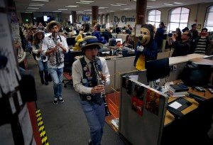 We get letters! One of them, from a reader expressing a dissenting view about Joe Garofoli’s peerless reportage, called him “Joe Garrulousphony.” Curiouser and Curiouser begs to differ…Yes, that was former city editor Alan Mutter paying us a visit the other day…The Cal Band, which has serenaded the Chronicle during Big Game week for the past five decades, came back once again, this time with 76 trombones to lead the big parade through the newsroom (minus 74 trombones). The band, per Carl (class of ’55) Nolte’s request, played the fight song about Stanford being found “in the tummy of the Golden Bear.” (although, in the Big Game, it apparently didn’t work out that way.) After the concert, Oski the bear, in the grand tradition of Oski, said absolutely nothing while posing for dozens of selfies, even more than action movie star Jackie Chan posed for when visited the newsroom some weeks earlier…Don Asmussen, addressing a class of third-grade journalists from Monroe Elementary School on a newsroom tour, said it’s perfectly OK to draw a cartoon that the president won’t like, and Kevin Fagan said that his favorite fruit is grapes and Leah Garchik said the best thing about being a journalist is that “sometimes you get free pizza”….Be the first to put in a bid for the swell $210 emergency earthquake survival kit that Kevin bought for a quake preparation story and was told he wasn’t allowed to keep, Inside are countless packets of hardtack that taste like hockey pucks, a genuine ’60s-era transistor radio for listening to the Giants upcoming even-numbered season and enough rope to tie up your glass-office occupant of choice. It will be auctioned off for Season of Sharing…